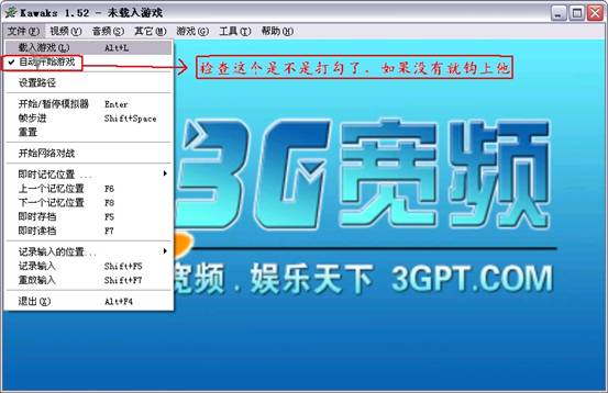 4, 雙擊winkawaks1.52.exe,就是那個(gè)K字形狀的圖標(biāo)^_^~然后點(diǎn)擊文件――載入游戲,而且檢查載入游戲下面的“自動(dòng)運(yùn)行游戲”是不是打勾了,如果沒(méi)有就鉤上他,如圖: