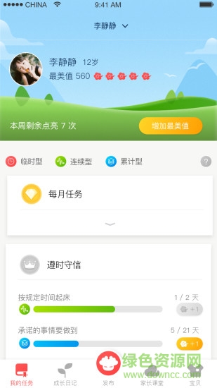 3、我的任務(wù):(臨時(shí)型任務(wù)、連續(xù)型任務(wù)、累計(jì)型任務(wù)):用戶通過來完成任務(wù)來增加最美值。