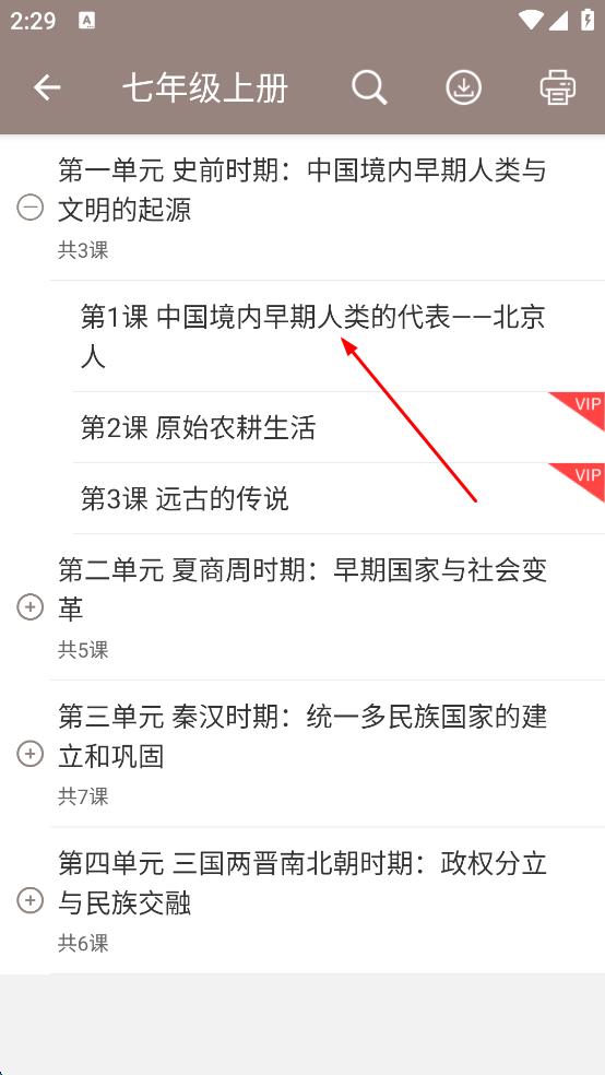 3、在七年級上冊內(nèi)容頁面,點擊第1課“中國境內(nèi)早期人類的代表——北京人”,進入該課知識點頁面。