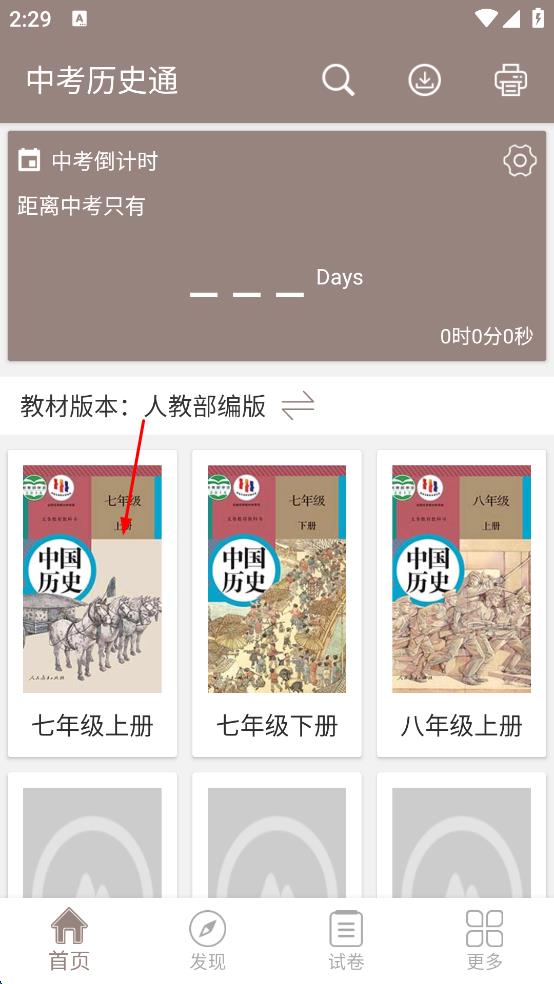 2、在中考歷史通首頁,選擇教材版本為“人教部編版”,點擊七年級上冊教材封面,進入七年級上冊內(nèi)容頁面。