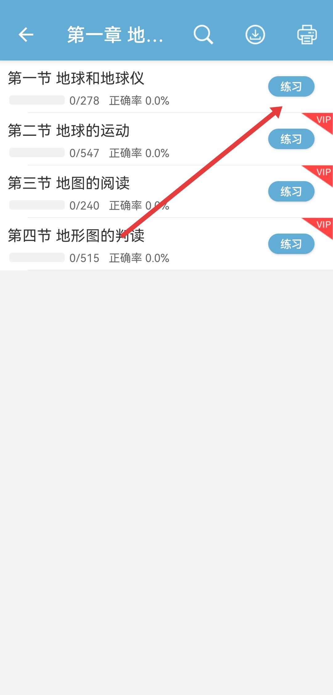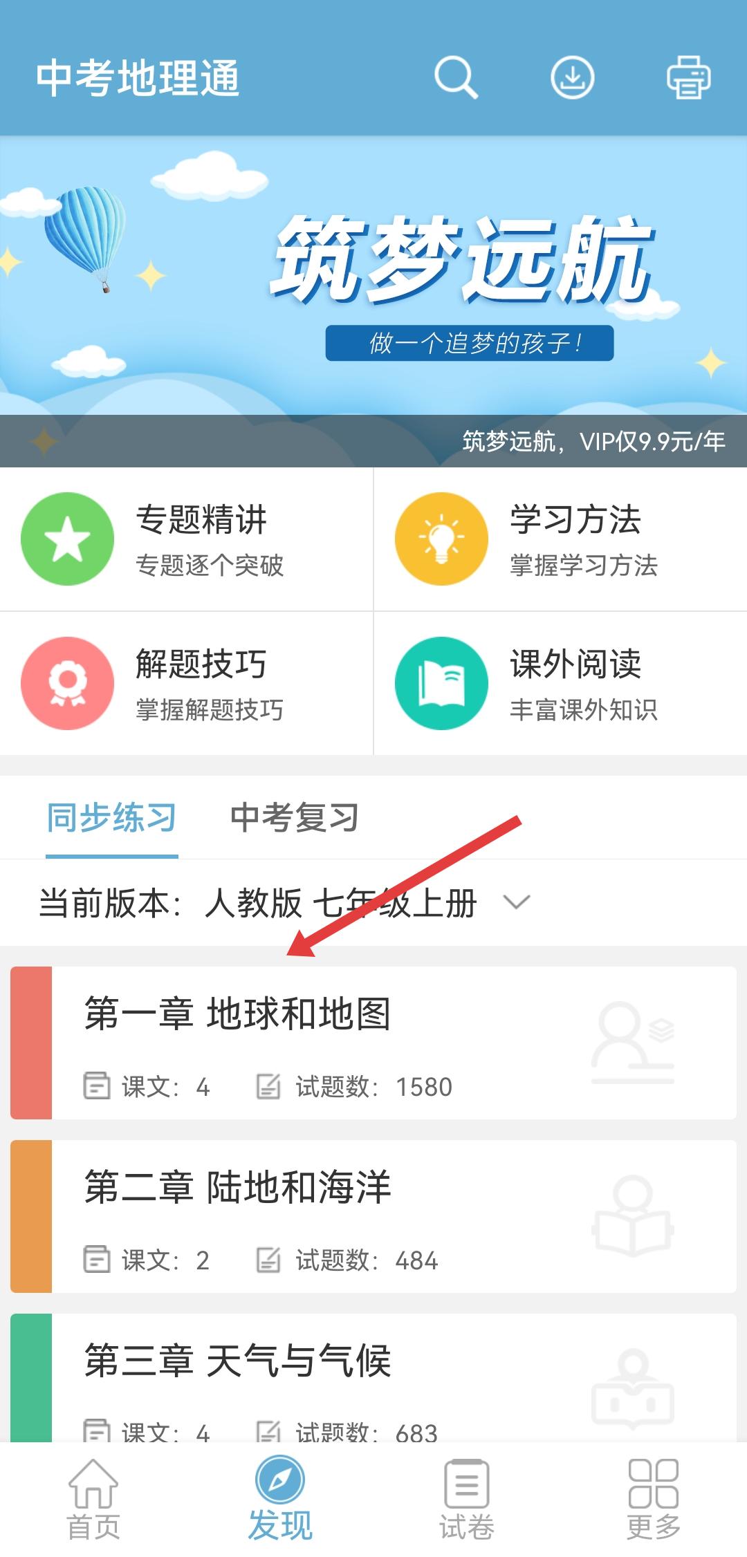 1、打開中考地理通APP,點(diǎn)擊發(fā)現(xiàn)在同步練習(xí)區(qū)域選擇要刷題的章節(jié)進(jìn)入。