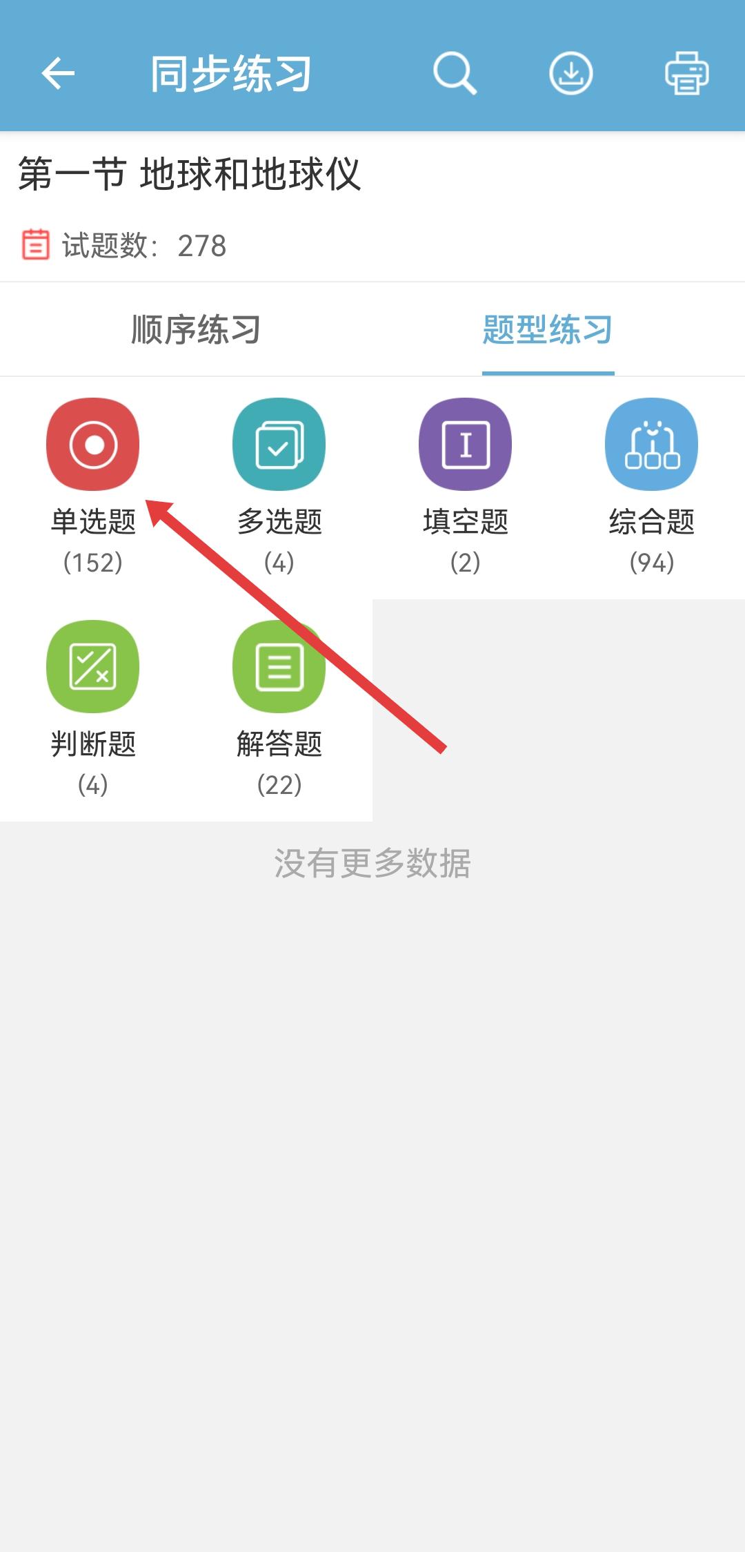 3、在同步練習(xí)頁面,選擇題型如單選題,點(diǎn)擊進(jìn)入題目練習(xí)界面。
