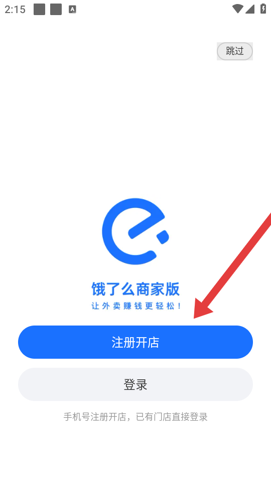 1、打開餓了么商家版APP,進入初始界面后,點擊注冊開店按鈕,啟動入駐流程,若已有門店,選擇下方登錄按鈕,憑賬號密碼進入管理端。