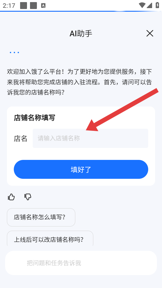 3、選定門店類型后,系統(tǒng)會喚起AI助手輔助入駐,助手首先詢問店鋪名稱填寫,在界面的店名輸入框內,如實填寫店鋪名稱。
