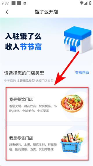 2、在餓了么開店頁面,選擇門店類型如餐飲門店、零售門店。