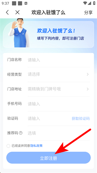4、在頁面填寫門店名稱等信息,點擊立即注冊,完成門店入駐操作。