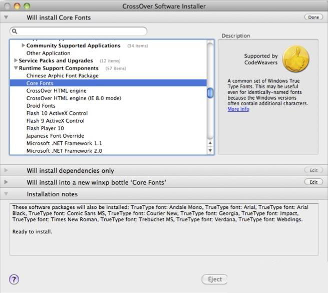 在第一項(xiàng)的 “Select an application to install” 上選擇 “Core Fonts”,隨后你可以把你 Windows 的字體文件全都拉過來去修文字亂碼這個(gè) Bug。