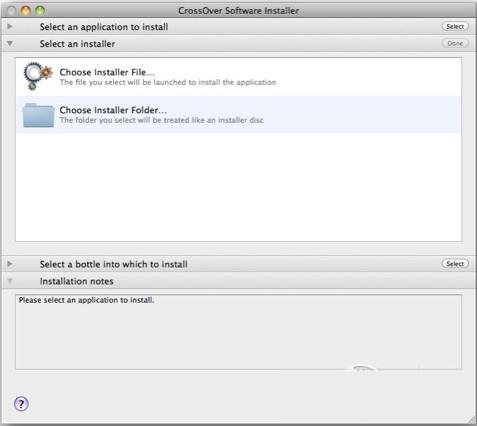 打開 Finder,把騰訊通 RTX 所需要的必須文件(本文最后會(huì)給出下載)放到 “你的用戶/Library/Application Support/CrossOver/Bottles/你的bottle名字/drive_c/” 路徑下。然后打開 Crossover,選擇 “Configuer-Install Software”。在這個(gè)窗口選擇 “Select an installer”,在 “Choose Installer Folder” 下面選擇你的騰訊通 RTX 安裝包。