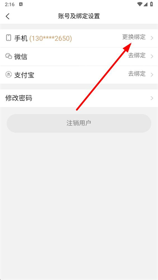 4、在賬號(hào)及綁定設(shè)置頁面,點(diǎn)擊手機(jī)選項(xiàng)右側(cè)的更換綁定。