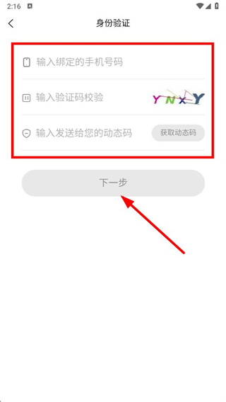 5、在身份驗(yàn)證頁面輸入相關(guān)信息并獲取動(dòng)態(tài)碼,輸入后點(diǎn)擊下一步,按提示完成新手機(jī)號(hào)綁定。