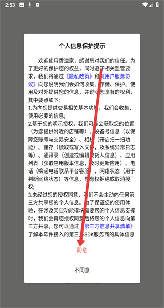 1、點(diǎn)擊“個(gè)人信息保護(hù)提示”彈窗的“同意”,進(jìn)入香溢家APP登錄界面。