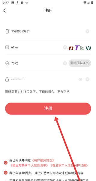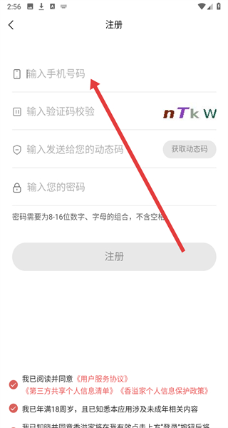 3、輸入手機(jī)號(hào)、驗(yàn)證碼校驗(yàn)、動(dòng)態(tài)碼和密碼,以及勾選相關(guān)協(xié)議和年滿18周歲的選項(xiàng)。