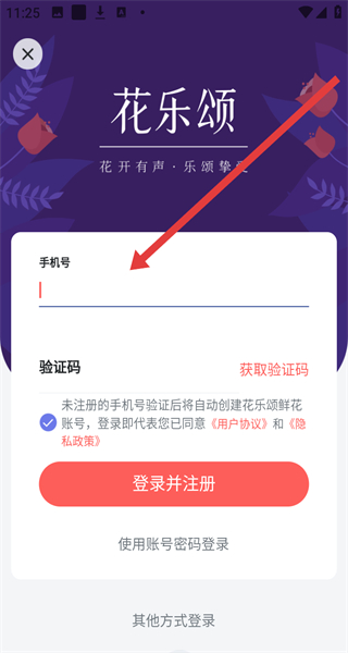 4、在登錄頁(yè)面輸入手機(jī)號(hào),點(diǎn)擊“獲取驗(yàn)證碼”,輸入收到的驗(yàn)證碼,點(diǎn)擊“登錄并注冊(cè)”,完成賬號(hào)注冊(cè)登錄操作。