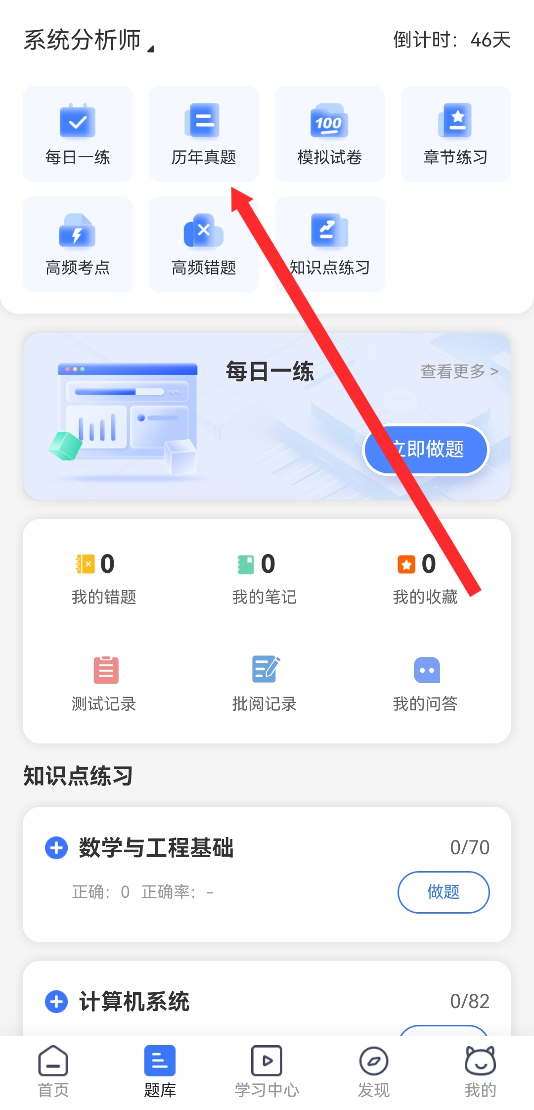 1、在題庫(kù)的頁(yè)面,需要點(diǎn)擊歷年真題,進(jìn)入歷年真題列表界面。