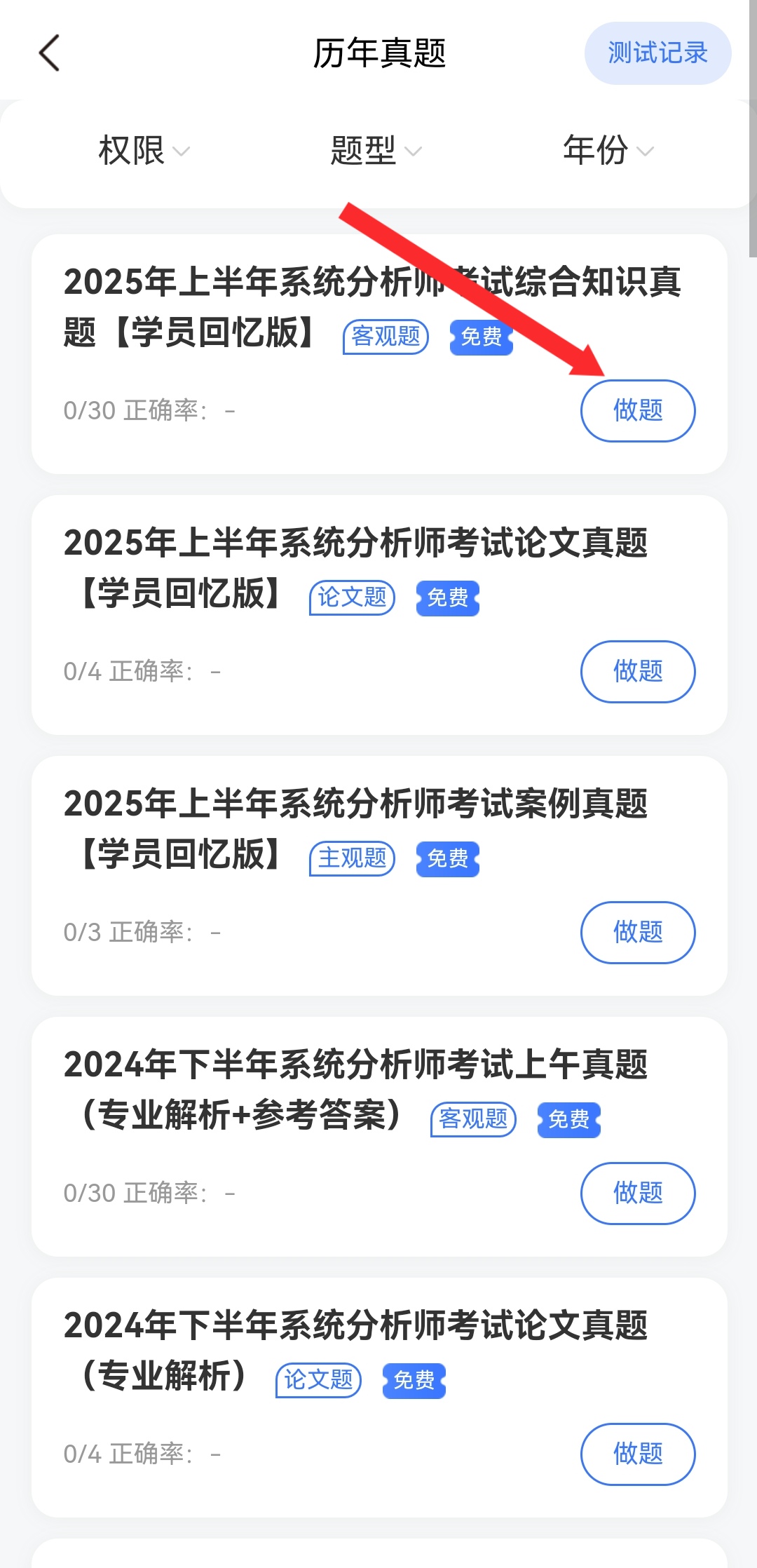 2、在歷年真題列表中,選擇目標(biāo)真題試卷,點(diǎn)擊做題進(jìn)入詳情頁(yè)面。