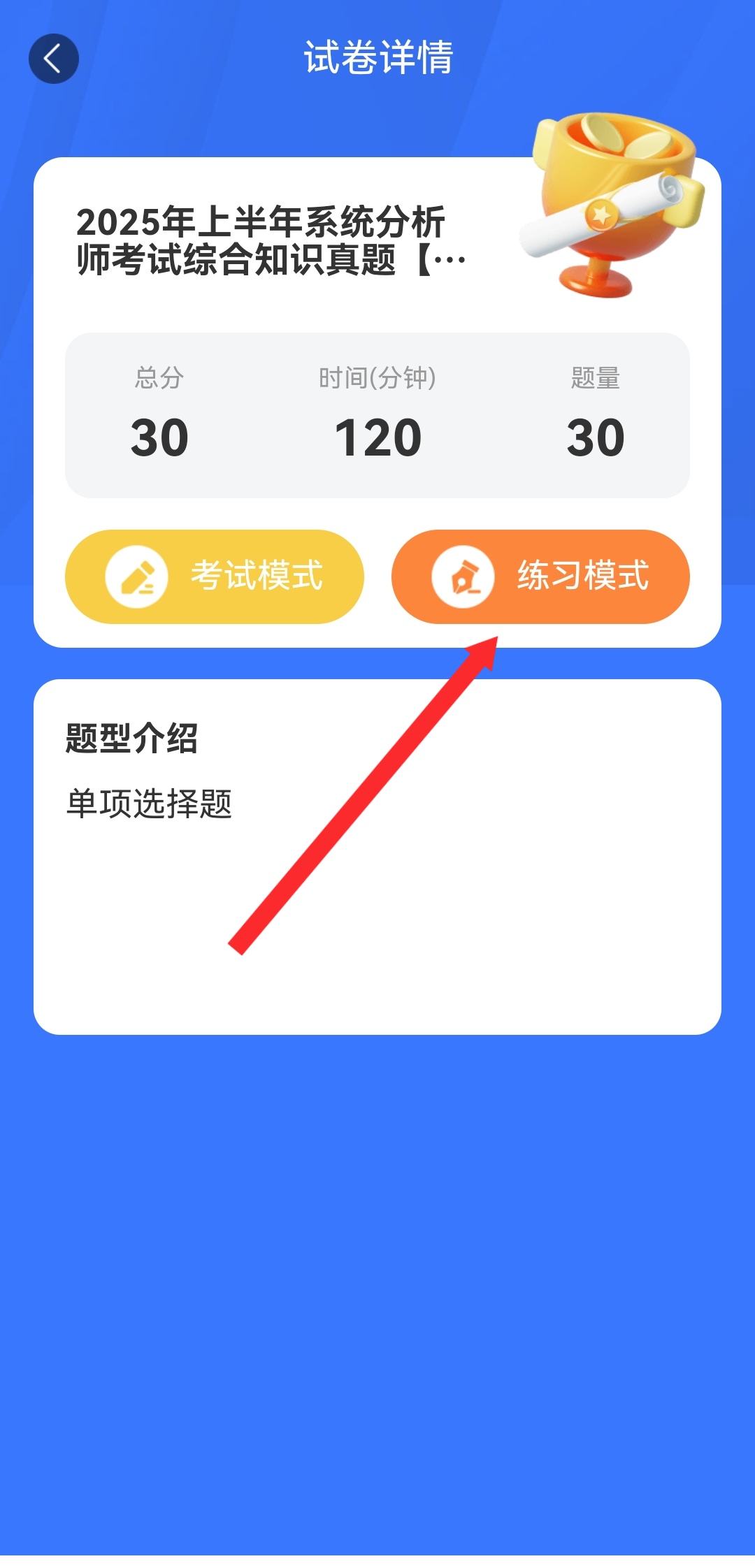 3、在試卷詳情頁(yè)面,點(diǎn)擊練習(xí)模式按鈕,進(jìn)入答題準(zhǔn)備的環(huán)節(jié)。
