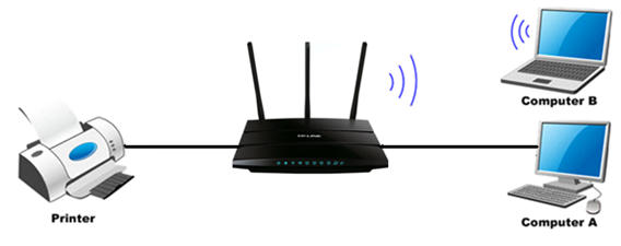 TL-WDR4310提供了網(wǎng)絡(luò)打印服務(wù)器的功能,可以實現(xiàn)局域網(wǎng)電腦共享打印機的需求,共享打印的網(wǎng)絡(luò)連接圖如下圖所示。