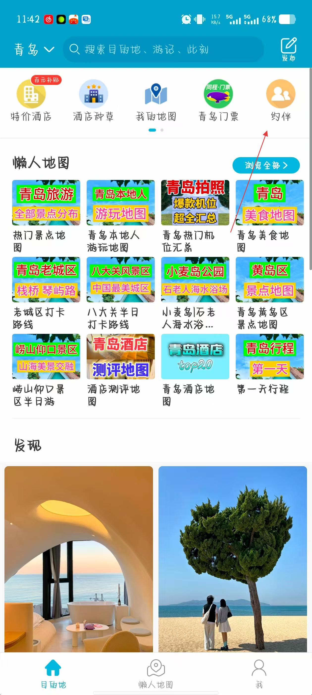 1、打開十六番旅行APP,在首頁點擊右上角約伴圖標。