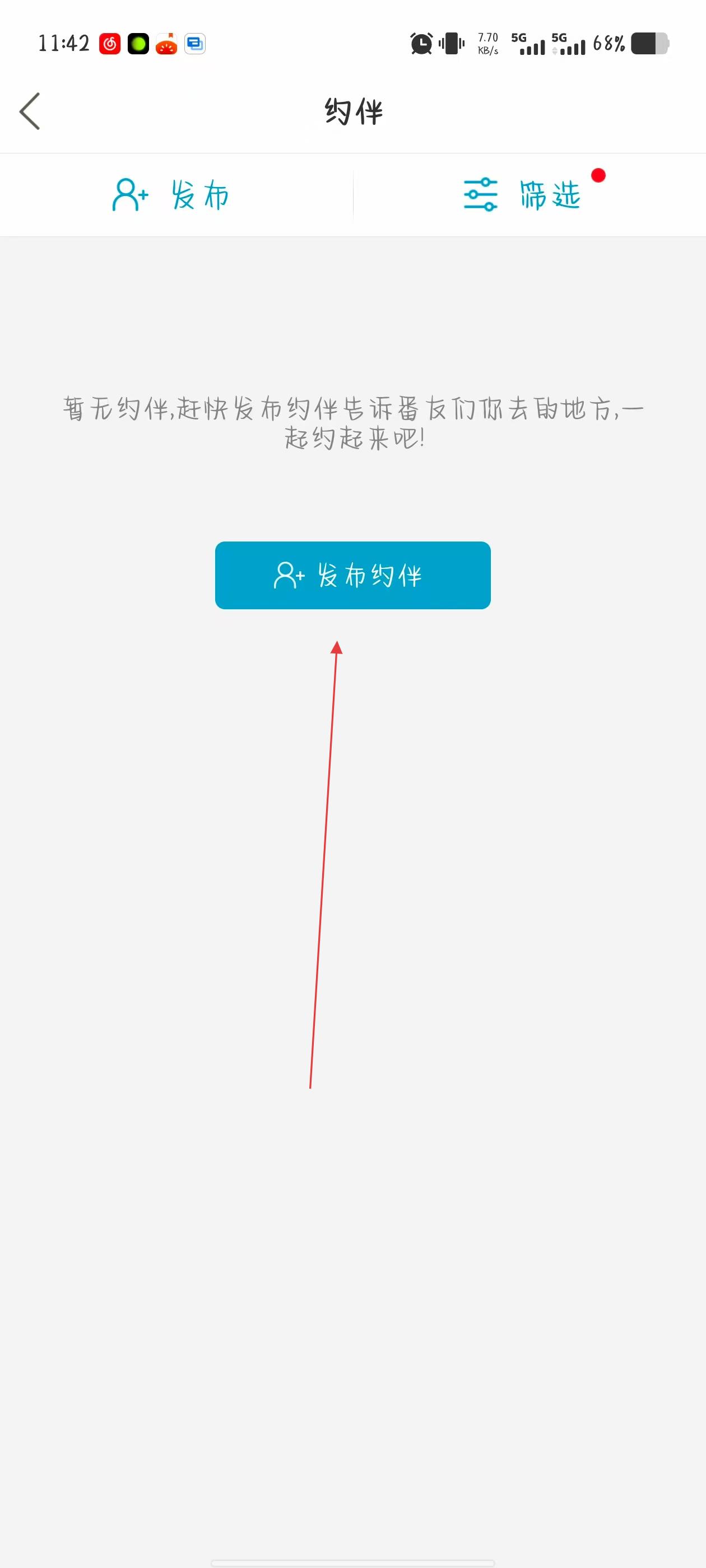 2、進入約伴頁面后,點擊藍色的發(fā)布約伴按鈕。