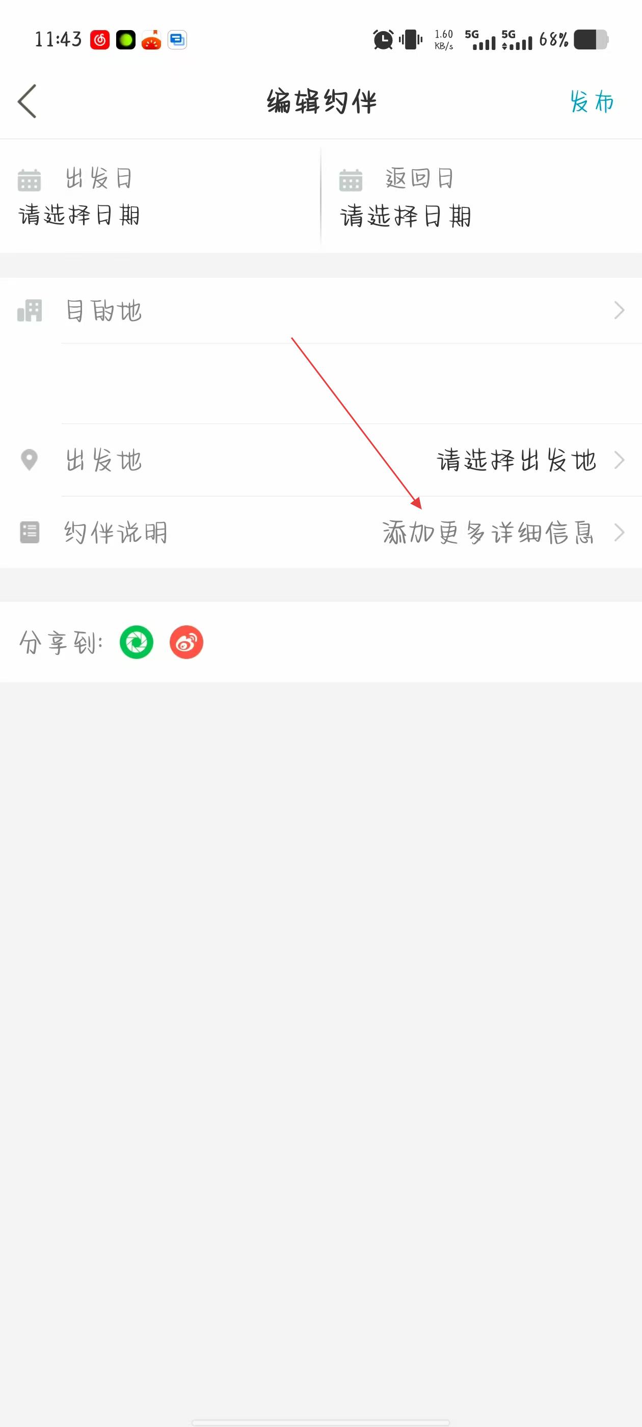 3、在編輯約伴頁面,依次選擇出發(fā)日、返回日、目的地、出發(fā)地,并點擊約伴說明右側(cè)的添加更多詳細信息。