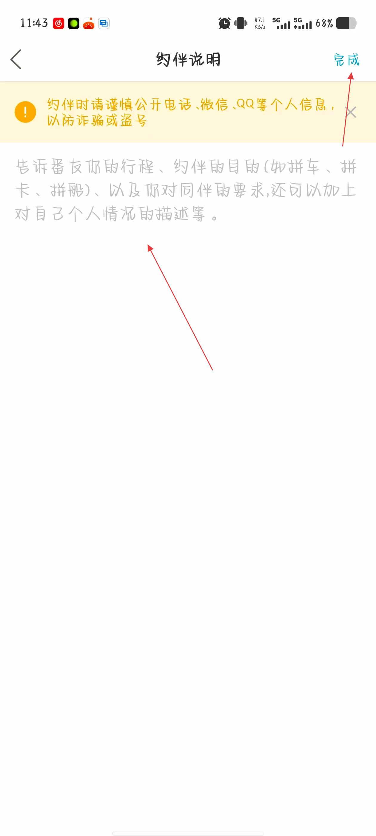 4、在約伴說明頁面,輸入行程、約伴目的及對同伴的要求等內(nèi)容,點擊右上角完成,之后返回點擊發(fā)布即可。