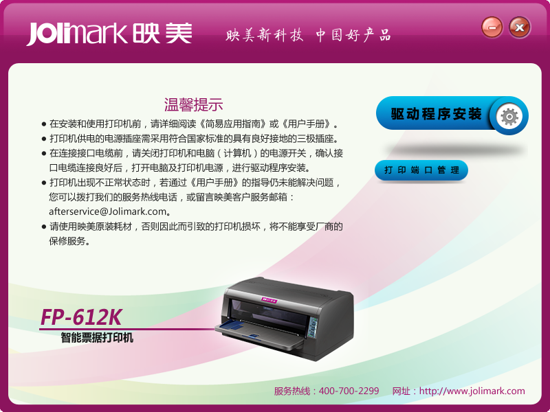 映美FP-612K發(fā)票打印機驅動是一款80列低噪型平推發(fā)票打印機的電腦驅動程序,優(yōu)化降噪的處理技術,大大減少了打印時的噪音污染,讓工作環(huán)境更舒適。可選無線藍牙、wifi接口,輕松實現(xiàn)便攜設備無線連接;1+3聯(lián)復寫能力,滿足國稅/地稅機打發(fā)票、網(wǎng)絡發(fā)票以及營改增發(fā)票的打印需求。為此小編特別為廣大網(wǎng)友帶來了映美fp612k驅動下載,支持32位和64位的win2000\winxp\winnt\win7等系統(tǒng),可以成功解決打印機不能正常打印或無法識別的問題,有此需要的朋友可免費下載收藏。