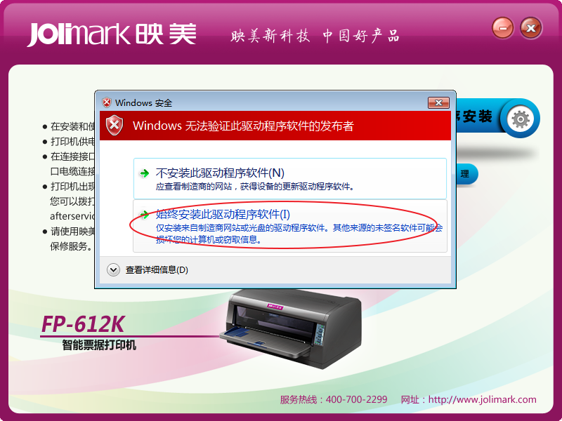 windows安全會攔截此條信息,點擊始終安裝即可繼續(xù)進行驅動的安裝過程,此驅動程序為官方版,請放心安裝。安裝完成后連接上打印機方可使用。