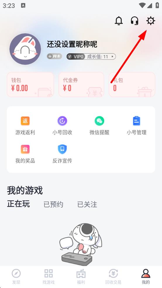 1、打開66手游應(yīng)用,點(diǎn)擊底部導(dǎo)航欄中的我的,進(jìn)入個人界面后,點(diǎn)擊右上角設(shè)置圖標(biāo)。