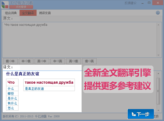 千億詞霸是一款中英俄三種語言國內(nèi)最全的互譯學(xué)習(xí)軟件,支持英譯中、英譯俄、俄譯中等三國語言的互譯,連接強(qiáng)大的詞庫,快速詳盡的顯示行業(yè)的釋義,只需在原文框或解釋框內(nèi)雙擊查詢詞,即可在千億詞庫內(nèi)查詢,得出精確的結(jié)果,俄中英三國語言輕松互譯。是一款不可多得的中英俄學(xué)習(xí)軟件。需要的朋友快來下載!