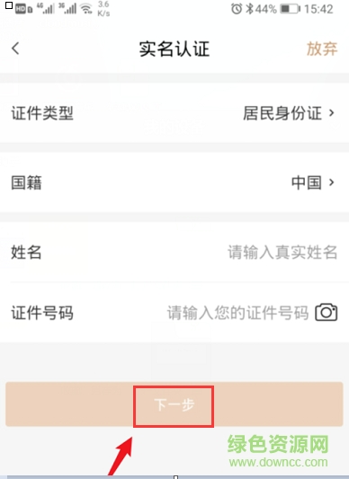 5.在實名認(rèn)證中,輸入個人的信息,點擊下一步,完成實名認(rèn)證。