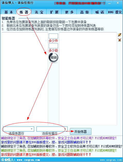 2、要煉器的話,先點(diǎn)擊【刷新】按鈕讓包裹中的裝備在左邊顯示出來(lái),然后雙擊左邊的裝備添加到待煉器的列表