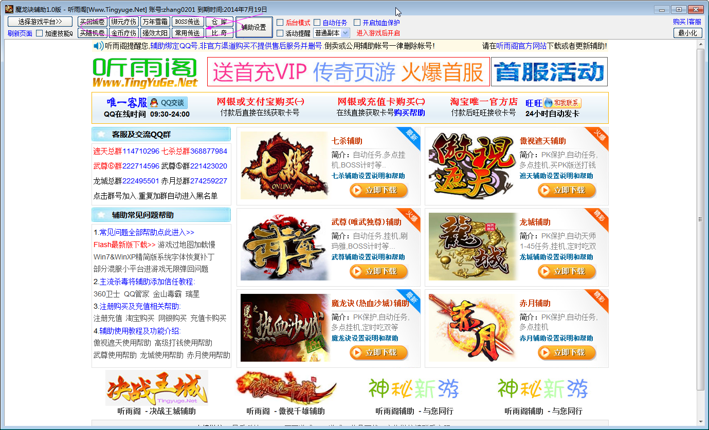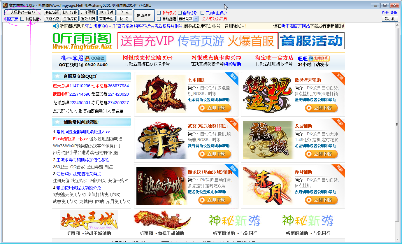 聽(tīng)雨閣魔龍?jiān)E輔助是一款功能強(qiáng)大的游戲輔助工具,專(zhuān)為游戲《魔龍?jiān)E》打造。為玩家們提供自動(dòng)加血、自動(dòng)掛機(jī)、BOSS計(jì)時(shí)、自動(dòng)任務(wù)等功能,為你節(jié)省大部分時(shí)間讓你輕輕松松玩游戲。