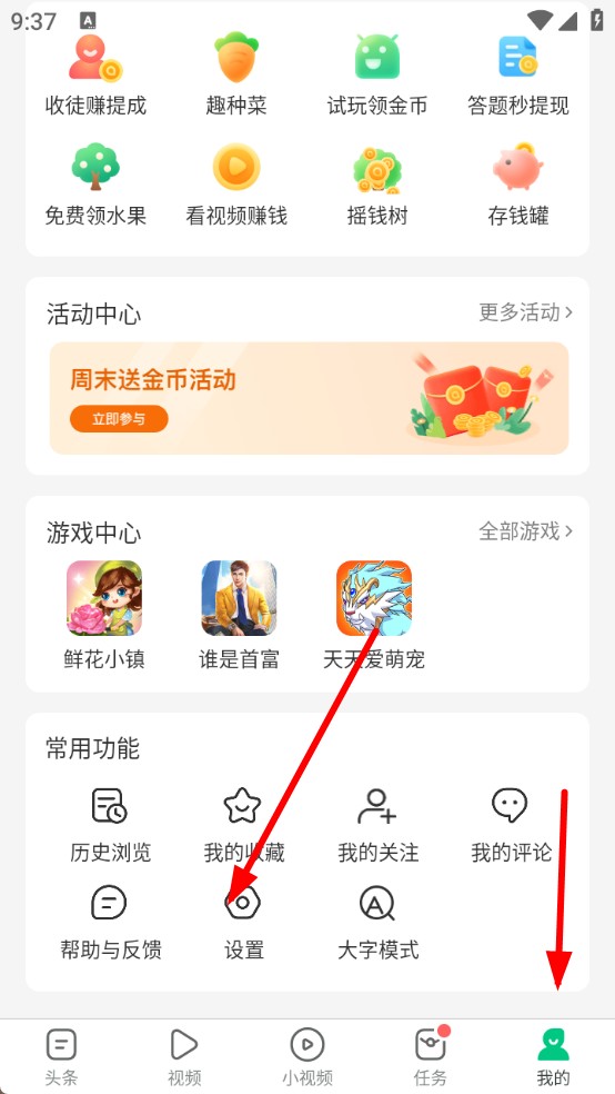 1、打開趣頭條APP,進入我的,進入個人頁面,在常用功能區(qū)域點擊設(shè)置。