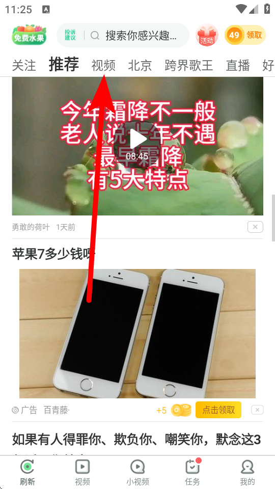 1、在趣頭條首頁,點擊視頻選項,進入視頻頻道頁面。