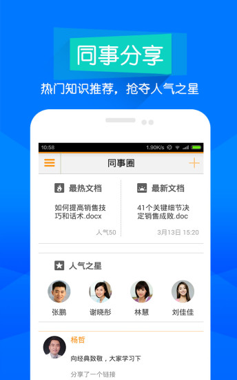 4、同事圈:分享知識(shí)、經(jīng)驗(yàn)和文檔,互動(dòng)點(diǎn)贊,有料又有趣。