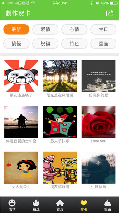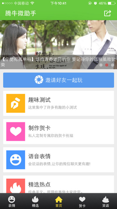騰牛微助手App為微信網(wǎng)友們定制七大特色主題賀卡,愛(ài)情、心情、生日、搞怪、祝福、特色、星座七大題材,數(shù)百款個(gè)性化免費(fèi)主題,搭配精心設(shè)計(jì)的背景音樂(lè)打造專屬于自己的“私人定制”賀卡哦!