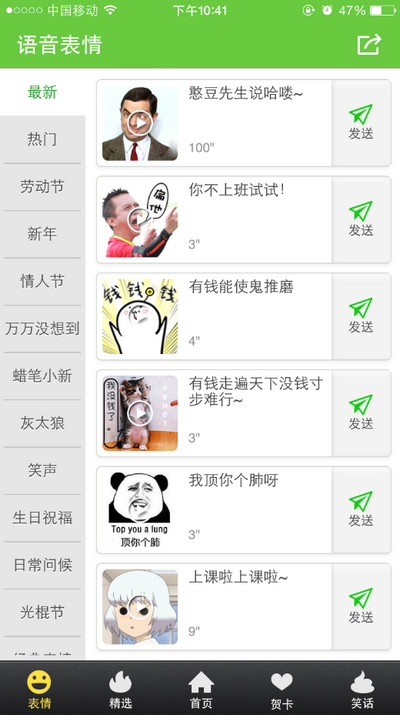 騰牛微助手App語(yǔ)音表情欄目,為大家搜羅了大量的表情,即將到來(lái)的勞動(dòng)節(jié)主題表情,剛剛過(guò)去的愚人節(jié)、情人節(jié)和春節(jié)主題表情,最新最熱的萬(wàn)萬(wàn)沒(méi)想到、十萬(wàn)個(gè)冷笑話、暴走漫畫(huà)、灰太狼表情讓你瞬間變聲表情帝。