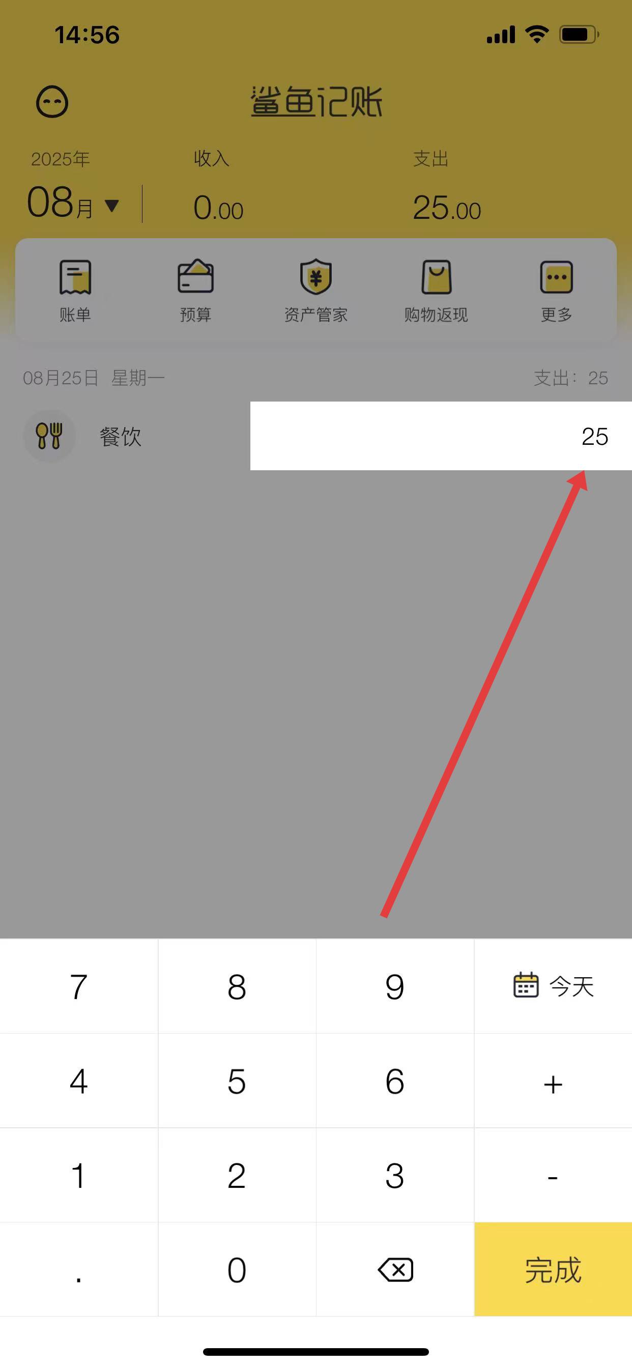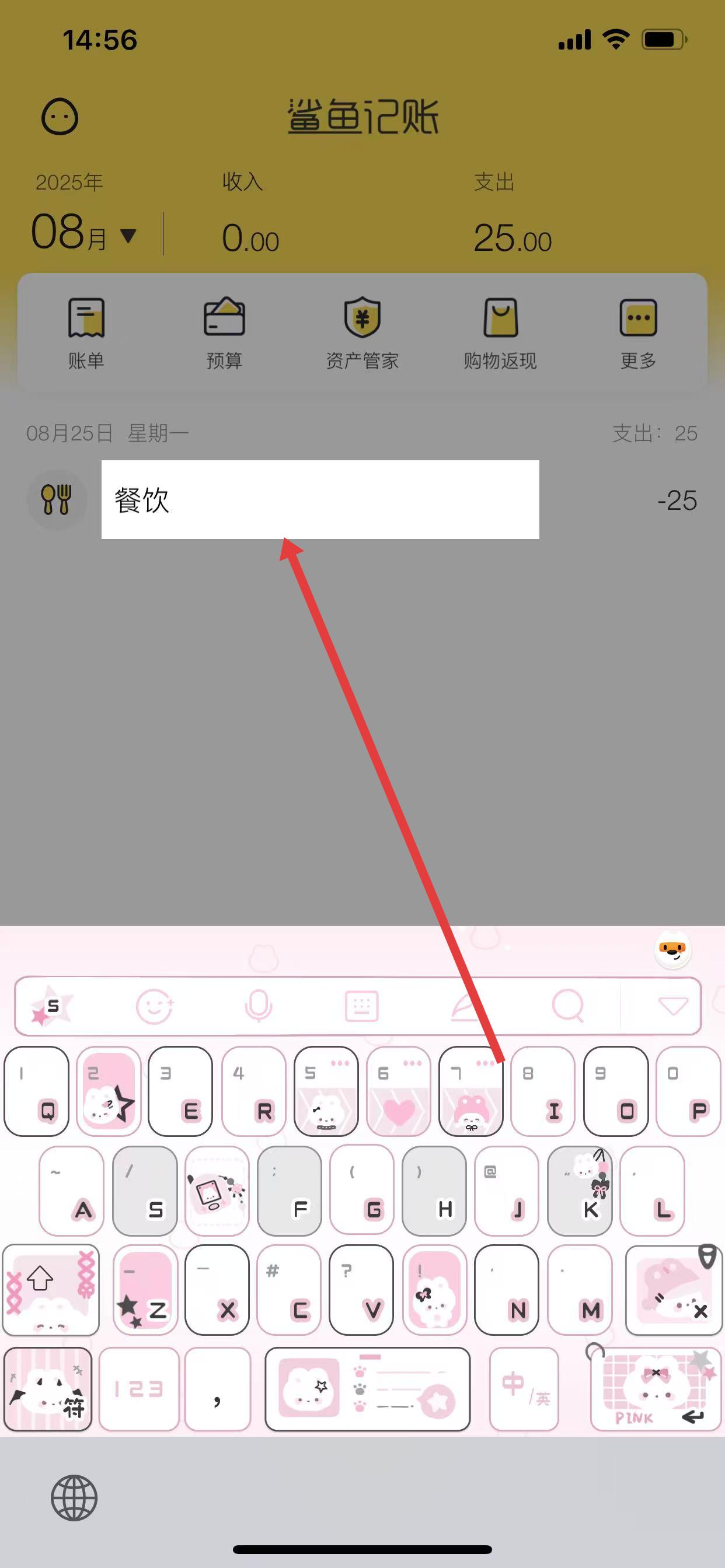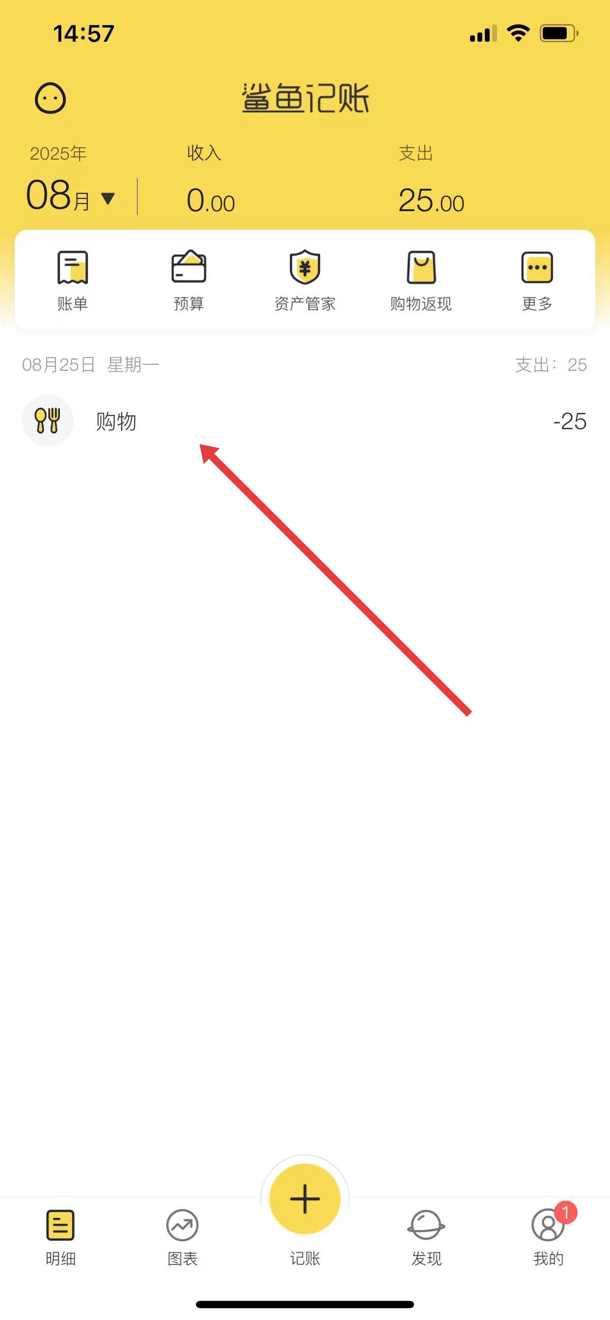 1、打開鯊魚記賬APP,修改記賬的類目,如把餐飲改成購(gòu)物。