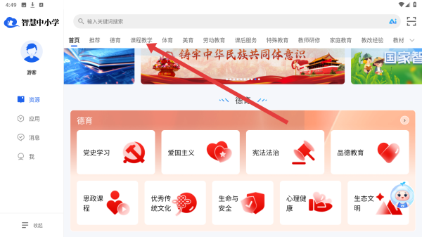 1、在智慧中小學(xué)平臺首頁,點(diǎn)擊頂部導(dǎo)航欄的課程教學(xué)選項,進(jìn)入課程分類頁面,查看各學(xué)科課程入口。