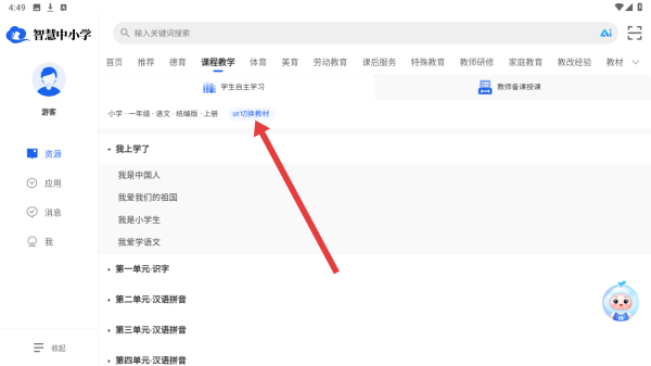 2、進(jìn)入課程教學(xué)頁面后,點(diǎn)擊切換教材按鈕,打開包含學(xué)段、年級、學(xué)科的篩選界面,準(zhǔn)備更換教材。