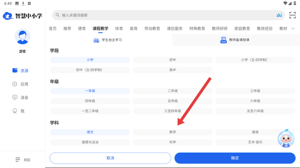 3、在教材篩選界面,找到學(xué)科選項欄,點(diǎn)擊數(shù)學(xué)按鈕,完成數(shù)學(xué)科目教材的切換,以便查看對應(yīng)課程內(nèi)容。