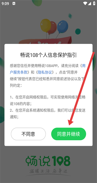 1、點(diǎn)擊同意并繼續(xù)按鈕,同意暢說108用戶服務(wù)條款和隱私協(xié)議,進(jìn)入APP首頁(yè)。