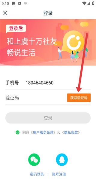 4、在登錄界面,輸入手機(jī)號(hào)碼后點(diǎn)擊獲取驗(yàn)證碼,將收到短信輸入到輸入框后,點(diǎn)擊登錄按鈕,完成登錄操作。