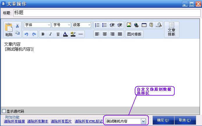 如果你需要隨機(jī)標(biāo)題或隨機(jī)的文章內(nèi)容,等,可以插入你自定義的偽原創(chuàng)隨機(jī)內(nèi)容