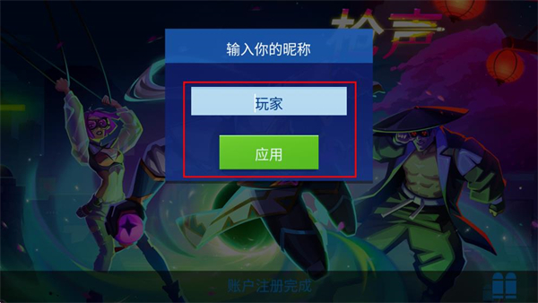 1、進入游戲界面,在昵稱輸入框填寫昵稱,點擊“應(yīng)用”按鈕完成賬戶注冊。