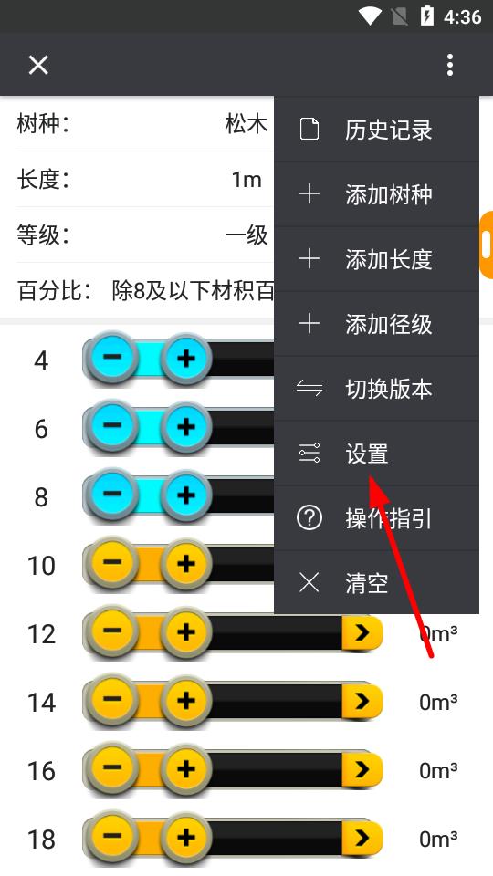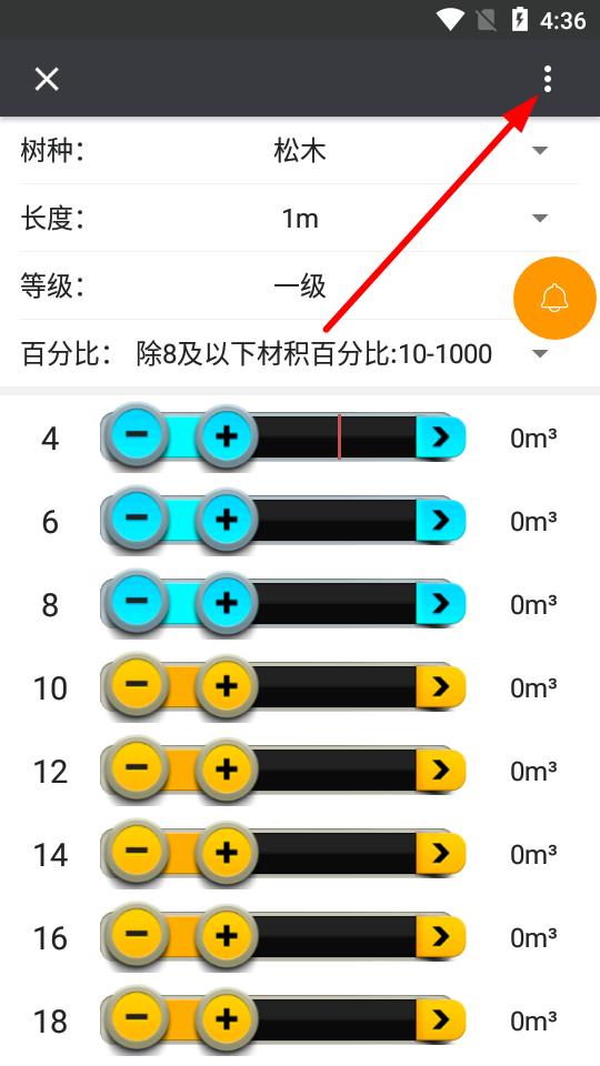1、打開材積計(jì)算器app,在操作界面中,點(diǎn)擊右上角的菜單圖標(biāo)。