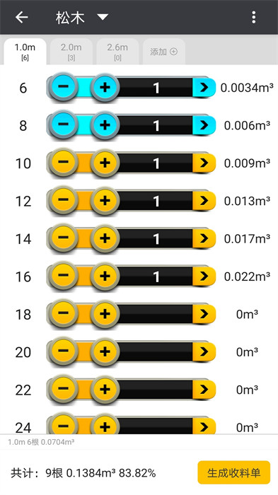 實(shí)用的木材行業(yè)工具,快速材積計(jì)算,材積表查詢,可設(shè)置不同樹種不同長(zhǎng)度不同徑級(jí)的價(jià)格,最終快速計(jì)算總價(jià),分類清晰結(jié)果明確,可分享計(jì)算結(jié)果。