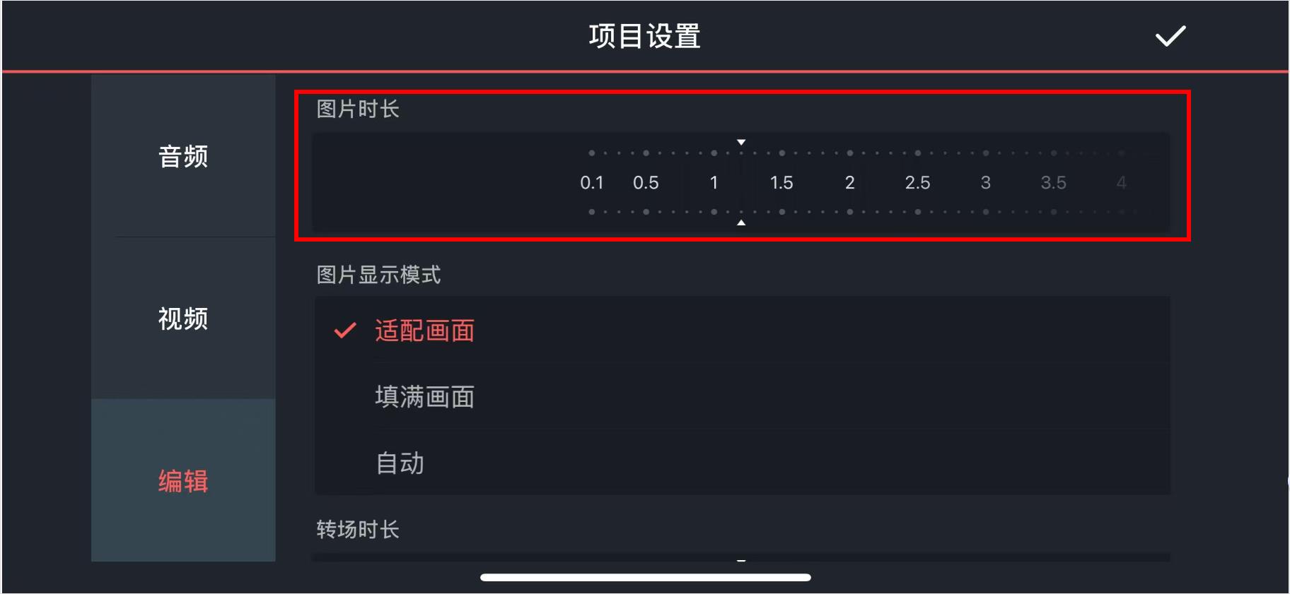 3、在編輯設(shè)置區(qū)域中,找到圖片時長調(diào)節(jié)欄,通過滑動圓點(diǎn)或選擇對應(yīng)數(shù)值,設(shè)置想要的圖片顯示時長。
