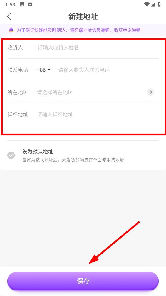 5、按提示填寫(xiě)收貨人姓名、聯(lián)系電話、所在地區(qū)和詳細(xì)地址后,點(diǎn)擊保存即可。