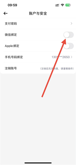 4、在頁(yè)面點(diǎn)擊微信綁定右側(cè)的開(kāi)關(guān)按鈕,按照提示完成微信綁定操作即可。